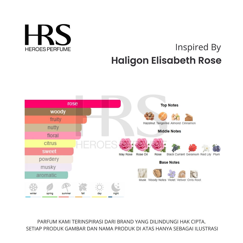 Top notes are Hazelnut, Tangerine, Almond and Cinnamon; middle notes are May Rose, Rose Oil, Rose, Red Lily, Plum, Black Currant and Geranium; base notes are Musk, Woody Notes, Violet, Orris Root and Vetiver.